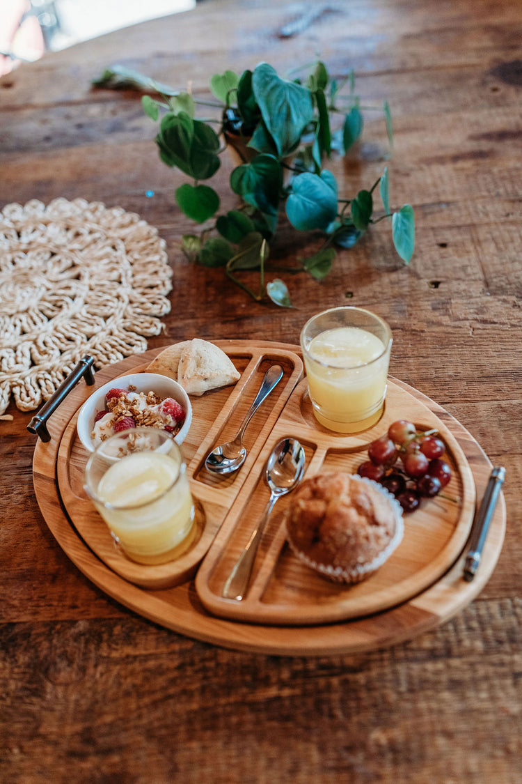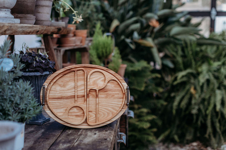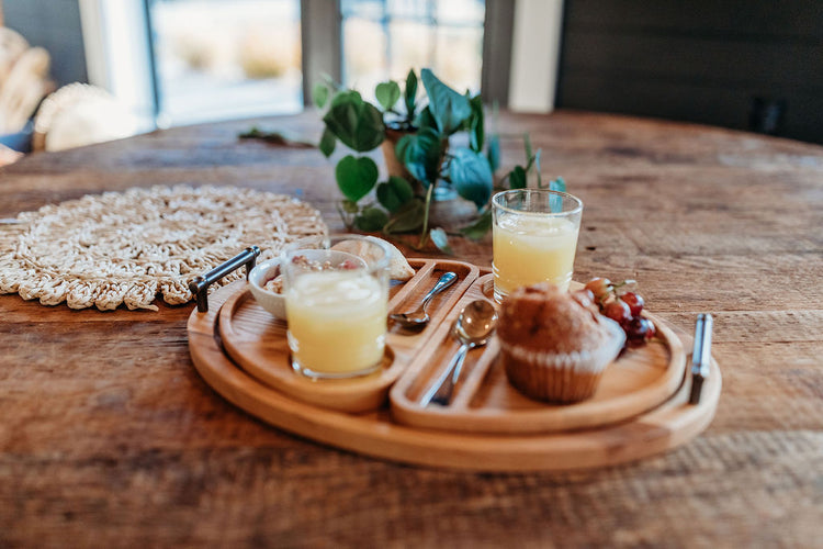 Stunning breakfast tray with gorgeous brass handles for steady carrying and two plates that fit snugly within. Each plate supports one mug / glass, space for your brekkie, and a perfectly sized slot for utensils. Perfect for those looking to slow down and enjoy the moment. Linger in bed a little longer and enjoy your breakfast or easily take it outside for morning al fresco dining.