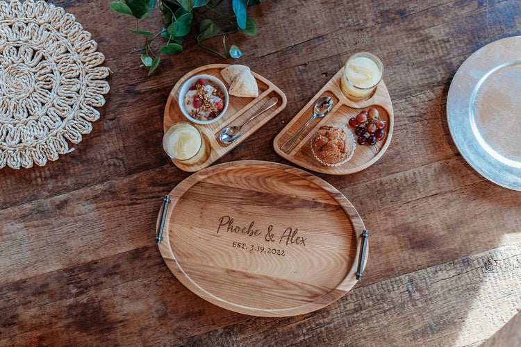 Amazing and unique gift for any occasions and for couples who want to swap their everyday morning routine for something truly special. This serving board comes in three pieces: large serving tray with beautiful warm chestnut antique brass handles, and two separate plates. Each plate has three purposeful cutouts: 3" diameter round cutout for your favorite mug or glass, 1.5" wide utensil cutout for a spoon, knife etc. and larger cutout for a pastry, bagel, cookie, fruit or whatever your heart desires :)
