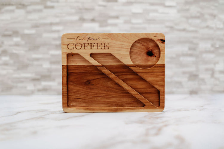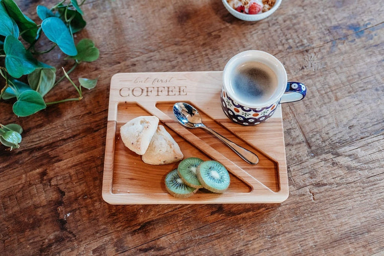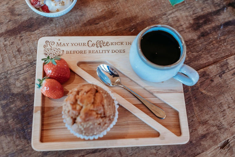 Engraved with a catchy slogan, this handcrafted bamboo tray is designed with three useful slots - one for your mug, one for your utensil, and one for your small bites. Now you can wake up and smell the coffee from wherever you like without having to juggle all your necessities! The clever yet beautiful engraving gives a nice touch and attractive look. The bamboo tray has three purposeful cutouts: 3" diameter round cutout for your favorite coffee mug, 1.5" wide utensil cutout for a spoon, knife etc. and larger cutout for a pastry, bagel, cookie, fruit or whatever your heart desires :) The perfect gift for those who like to take their coffee in bed or on the porch. Just sip, relax and make it your special moment of the day.