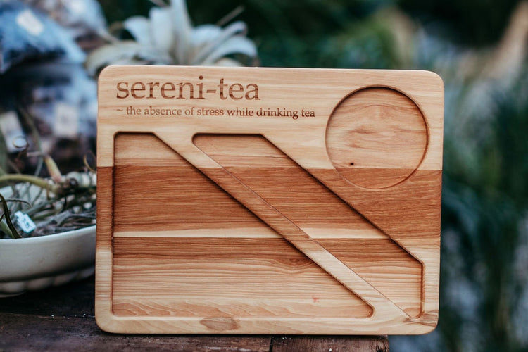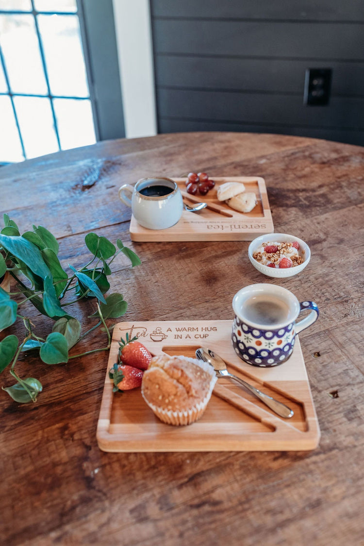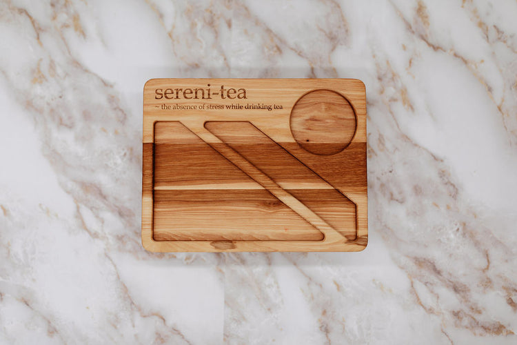 It's TEA TIME! We all could use that warm hug during our busy day. Take a few moments to relax and enjoy a warm cup of tea, true Serenity... Or maybe some refreshing iced tea in the summer. With a delightful and fun tea time engraving, this board boasts three cutouts; one for your mug / glass, one for your utensils, and one for your toast or pastry. Take your tea time ritual mobile to your favorite comfy spot in the house or outside on the patio where you can take a beat and enjoy the day. This handcrafted tray makes for the most thoughtful of gifts for the tea connoisseur in your life.
