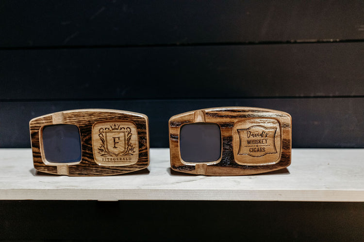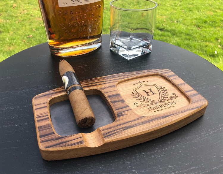 Elegant, finest quality, piece of craftmanship! Handcrafted with FSC certified white oak, toasted for character, this stunning board is super classy for your nightly whiskey + cigar combo. Designed with two sections - one for your whisky glass and one for your cigar and ash. Ashtray side is laid with 2.75" 16 gauge hot rolled steel sheet to protect the wood underneath. The 3" glass holder conveniently fits square and round whisky glasses and it can be personalized. Great gift for Him!